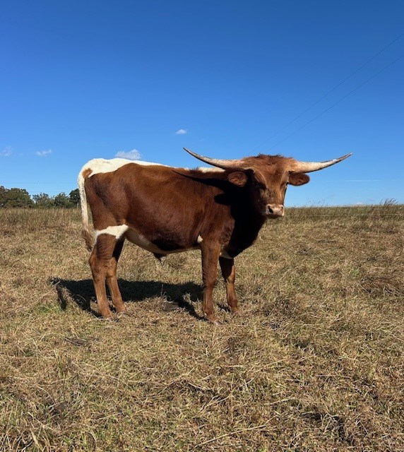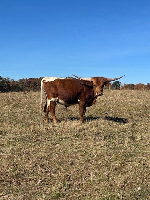 Beefy little bull that is starting to brindle. His sire is an exciting young bull KCCI Hangin On 2 U, an own son of MC Hangin Tuff, and is 94.5 inches TTT at 3.5 years old. His dam is a great all around tri-colored cow and a good milker. We like how this little bull is growing with his straight back and beefy hip. We are watching him closely as a junior herd sire prospect.